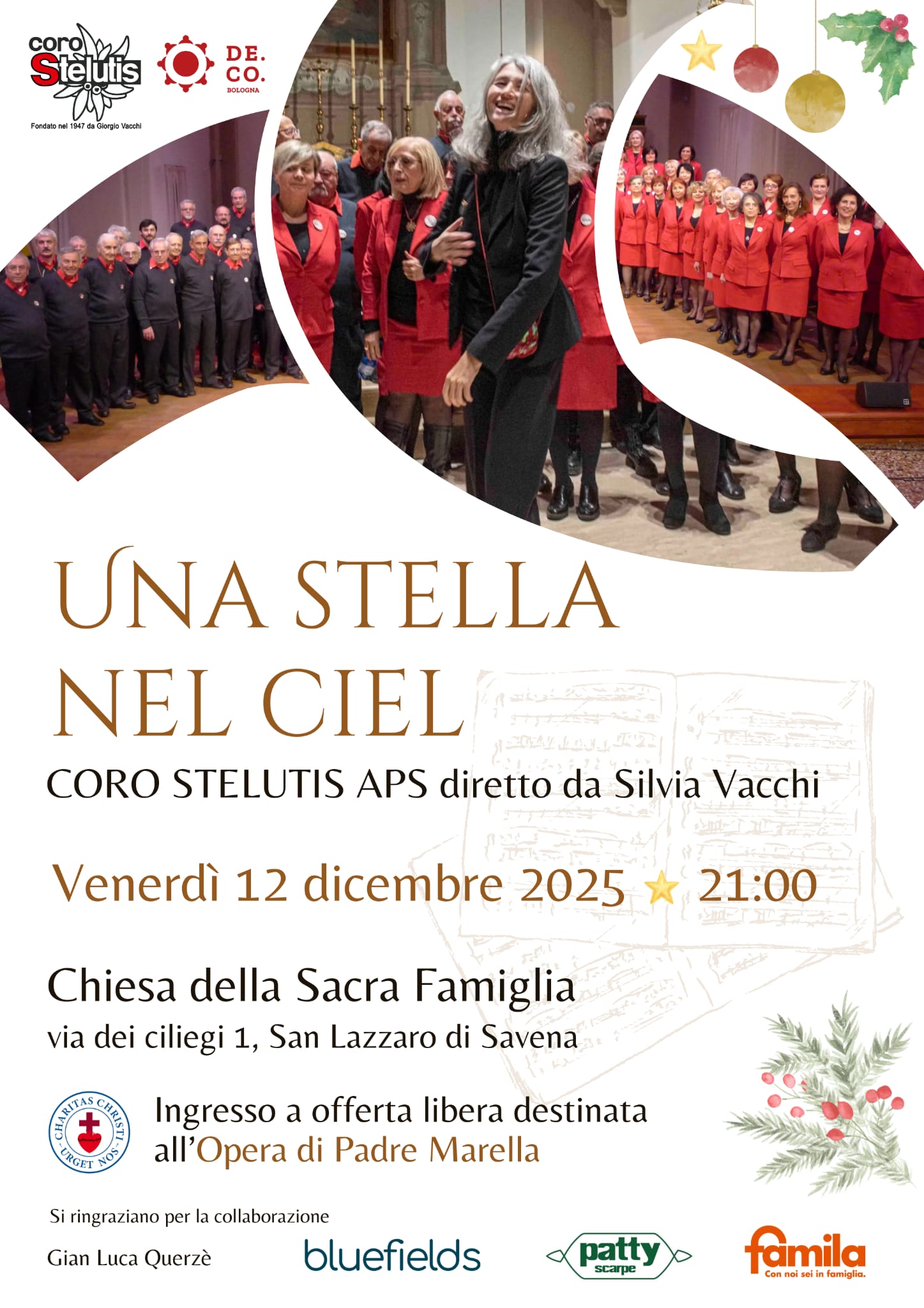 Nel volantino, alcune foto di repertorio del Coro Stelutis di Bologna invitano il pubblico al concerto "Una stella nel ciel" che si terrà venerdì 12 dicembre alle ore 21 presso la chiesa della Sacra Famiglia in via dei ciliegi 1 a San Lazzaro.